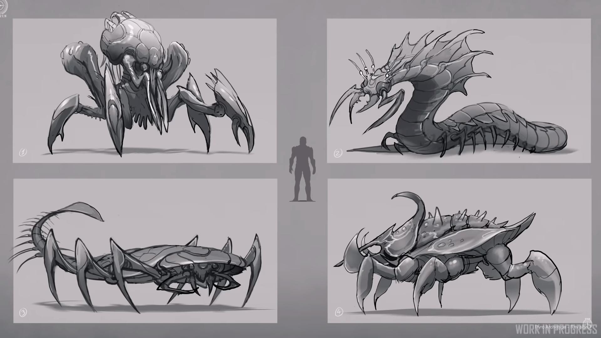 De tous les concepts réalisés, deux ont été retenus pour l’instant. Le premier est une sorte de crabe géant que nous retrouverons sur le système Pyro. Ces animaux seront rassemblés autour d’une reine, plus imposante, et pourront se camoufler sous forme de rocher.