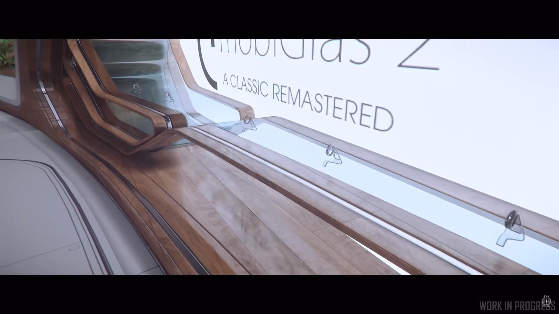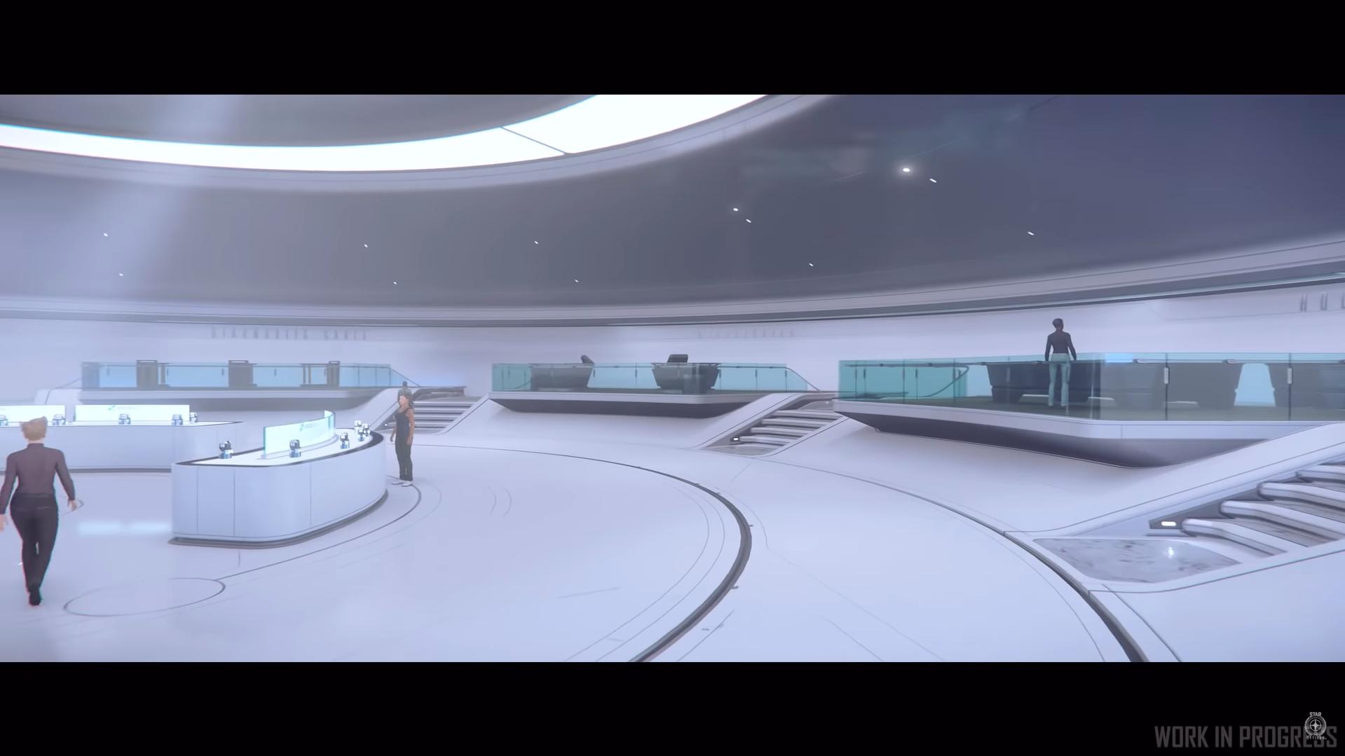 Le bâtiment est divisé en trois étages, le lobby dans lequel vous entrerez et où vous trouverez un modèle de la toute première mobiGlas. En descendant, vous trouverez le magasin et divers objets à acheter. Au dernier étage se trouve un amphithéâtre servant de lieu d’exposition pouvant aussi servir d’espace de présentation de nouveaux produits.